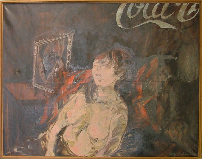 l'opera rappresenta una figura femminile, a mezzo busto nudo, nello scorcio di una stanza in penombra, forse un locale pubblico con l'evidenza di una insegna della Coca-Cola (da cui il titolo). In basso a destra reca la firma e la data