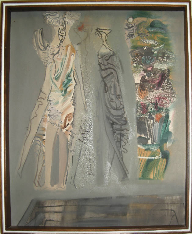 - NOTIZIE STORICO CRITICHE Il dipinto venne realizzato nel 1947 da Francesco Cristofanetti, che dipinse forme umane per un periodo di circa 15 anni, dal 1936-37 fino al 1950 circa: le sue figure sono soggetti evanescenti, spesso con ali, che emergono dallo spazio grigio circostante grazie alle loro vesti colorate, liriche ed eleganti, nel tentativo di tradurre in pittura più che la rappresentazione fisica del moto, l'essenza stessa del movimento, una dimensione del volo più astratta e mentale. Allo stesso modo dal campo monocromo di fondo emergono anche piccoli frammenti di paesaggi, colline, alberi, applicati sulla tela grazie a pennellate vibranti e nuove, quasi musicali.