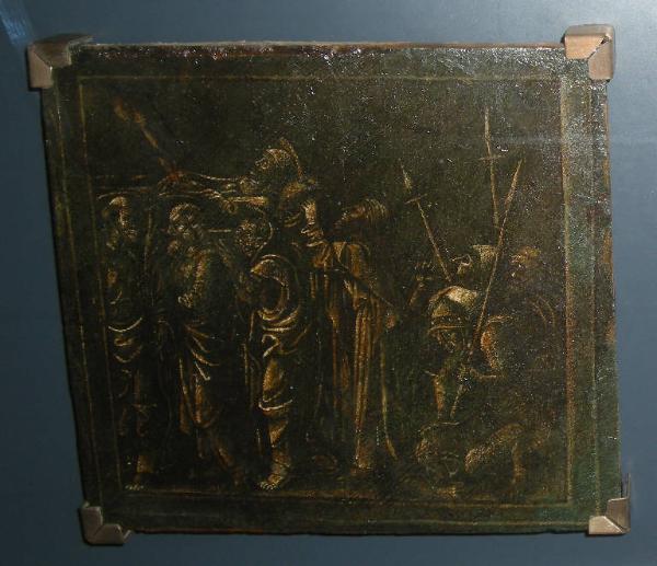 - NOTIZIE STORICO CRITICHE La tavoletta dipinta appartiene Collezione Verga, acquistata nel 2000 dalla Regione Lombardia dal collezionista Daniele Verga e poi depositata su suggerimento di Federico Zeri presso i Musei Civici di Pavia, per riunirla ad un'altra tavoletta (oggi divisa in due) raffigurante anch'essa "Storie della Vergine e di Cristo" e attribuibile allo stesso autore, un anonimo maestro lombardo della metà del XV secolo. Le sette tavolette nel loro insieme, erano probabilmente unite a formare gli scomparti di un dossale o di un altarolo portatile, come si evince dalla presenza di tagli e tracce di cerniere distribuite lungo i margini; inoltre la similarità con l'opera della Pinacoteca Malaspina ha fatto ipotizzare una loro collocazione con la funzione specifica di sportello e la conseguente doppia visione sia dal recto che dal verso (la tavoletta di Pavia è infatti dipinta a colori da un lato e a monocromo dall'altro) (Ottolenghi, 2000).\nL'ambito storico-artistico di appartenenza è quello di un maestro lombardo della metà del Quattrocento, ricollegabile alle opere tarde di Michelino da Besozzo, ma ormai aggiornato alla produzione tardogotica più moderna della bottega cremonese di Bonifacio Bembo, presente anche a Pavia (Tesori salvati, 2000): egli dipinge a monocromo, facendo emergere le sottili figure dal fondo scuro color malachite con sapienti pennellate più o meno cariche di biacca, il cui ductus si alterna a tratti parallelo e a tratti più libero e sciolto, secondo le modalità documentate nella produzione su tavola, affresco e miniature sviluppatasi nell'area settentrionale fra il II° e il III° quarto del XV secolo (Ottolenghi, 2000).