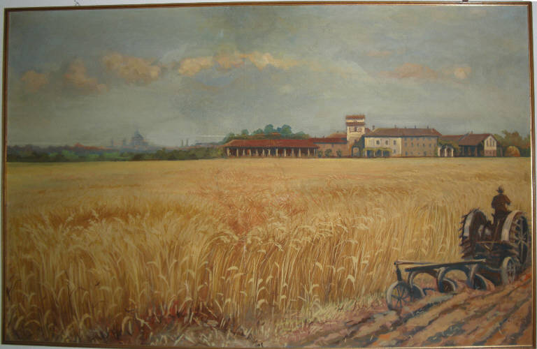 Il dipinto raffigura un tipico paesaggio della campagna pavese: più di metà della composizione è occupata dalle alte spighe di grano maturo mentre nell'angolo in basso a destra è visibile l'unico tratto di terra brulla, dissodata da un uomo che conduce un trattore con aratro. Sullo sfondo, ad enfatizzare il distacco tra le messi dorate e l'azzurro del cielo, si staglia il profilo di alcune cascine e dei monumenti cittadini ancora più in lontananza.