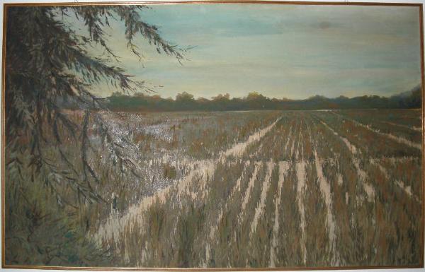 Il dipinto raffigura un tipico paesaggio della pianura pavese: più di metà della composizione è occupata dalle risaie, i cui filari si susseguono in una perfetta prospettiva centrale, enfatizzata dalla presenza delle fronde di un albero in primissimo piano sul lato sinistro del quadro.
