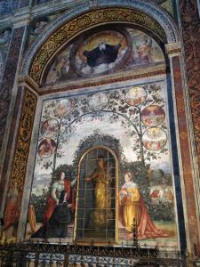 Dipinto murale raffigurante Santa Caterina d'Alessandria e un'altra santa di difficile identificazione, che presentano una monaca inginocchiata alla figura della Vergine Maria (scultura nella nicchia); ai lati delle due donne sono collocati, la ruota del martirio di S. Caterina sulla sinistra, e l'episodio biblico di "Susanna e i vecchioni" sulla destra. Sullo sfondo, costituito da un fitto cespuglio di rose, i rami più esterni sviluppano nella parte alta girali che formano sette tondi, all'interno dei quali sono illustrate le Sette Gioie della Vergine (da sinistra verso destra: Annunciazione, Nascita di Gesù, Adorazione dei Magi, Resurrezione di Cristo, Ascensione di Gesù, Pentecoste, Assunzione della Vergine in cielo). Nella lunetta sovrastante l'affresco è raffigurato il Padreterno in un tondo tra le nuvole, circondato da angeli musicanti.