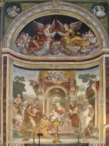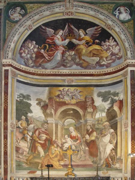 - NOTIZIE STORICO CRITICHE Il dipinto murale è collocato nella terza cappella a destra della Chiesa di S. Vittore, in corrispondenza dell'altare dedicato ai Magi: l'opera è stata attribuita in un primo momento (Maderna, 2001) ad Aurelio Luini, figlio più giovane del pittore Bernardino Luini, per l'alta qualità dell'esecuzione, e più di recente da Giovanni Agosti e Jacopo Stoppa (Tosi, 2014) ad un autore sconosciuto che risente dello stile di Calisto Piazza, forse lo stesso che eseguì nel 1556 il dipinto raffigurante le "Nozze di Cana" nella chiesa di San Maurizio al Monastero Maggiore a Milano.\nL'iconografia dell'offerta dei doni a Gesù da parte dei Magi ha avuto nell'arte una straordinaria fortuna, in particolare nelle rappresentazioni della Natività e del presepe: il testo dei Vangeli sinottici a questo proposito (Mt 2, 1-12) è piuttosto scarno di particolari ed è la successiva tradizione cristiana che ha poi fornito utili dettagli per la formulazione di una vera e propria iconografia dell'evento. Il passo di Matteo non fornisce ad esempio il numero esatto dei Magi nè indicazione dei loro nomi, ma la tradizione più diffusa li ha spesso identificati come tre saggi, basandosi sul fatto che vengono fatti a Gesù tre doni, ed ha assegnato loro i nomi di Melchiorre, Baldassarre e Gasparre. Altra evoluzione successiva è il passaggio dalla condizione di astrologi (Magi è la traslitterazione del termine greco "magoi", che nel tempo ha indicato filosofi e scienziati così come stregoni e astronomi) a quella di re, da cui la presente rappresentazione con le corone sulla testa o sui copricapi. Nel dipinto qui esaminato i Magi vengono rappresentati secondo l'iconografia più diffusa: Melchiorre, il Mago più anziano, è il primo ad inginocchiarsi davanti a Maria e a porgere l'oro al Bambino, che qui è già stato accolto e viene tenuto fra le mani da San Giuseppe; secondo dietro di lui, Gasparre, il più giovane, con in mano il vaso contenente la mirra; sull'altro lato Baldassarre, di carnagione scura, con il contenitore dell'incenso, qui arricchito dall'insolita presenza di un bambino di colore ai suoi piedi, intento ad allacciargli un calzare. Un analogo ragazzino è presente a Saronno del Santuario della Madonna dei Miracoli, dove Bernardino Luini dipinse l'"Adorazione dei Magi" nel 1525-1526, elemento questo che farebbe propendere per un autore del dipinto qui schedato molto vicino alla sua bottega o comunque sicuramente debitore dell'impostazione alla scena da lui data. La presenza di un corteo in avvicinamento alle loro spalle, sulla sinistra della composizone, ha invece un'origine più tarda, attestata come rievocazione storica in alcune città italiane fin dal Medioevo, e particolarmente rappresentata in pittura a partire dall'epoca tardo-gotica fino a tutto il Rinascimento, con una particolare attenzione alla ricchezza delle vesti e dei finimenti degli animali, qui ben esemplificata dal cavaliere all'estrema sinistra della composizione, subito dietro Gasparre. Ciò in cui questo affresco si differenzia dalla tradizionale trattazione lombarda del tema è invece l'inserimento dell'episodio evangelico, non vicino alla consueta capanna, bensì sotto ampie architetture classicheggianti in avanzata rovina, che tradiscono ascendenze fiorentine, sul modello delle numerose opere di Botticelli: queste rappresenterebbero iconograficamente la cultura pagana antica che viene definitivamente distrutta dalla nuova civiltà cristiana.\nInteressante la presenza alla base della scena, perfettamente inserito nella cornice dipinta che circonda il profilo della cappella e lo spazio dell'affresco, di un trompe l'oeil raffigurante un piano marmoreo sopra il quale sono appoggiati due strumenti essenziali della liturgia: a sinistra, un messale borchiato chiuso, e a destra, un vassoio dorato con due ampolle rituali contenenti acqua e vino.