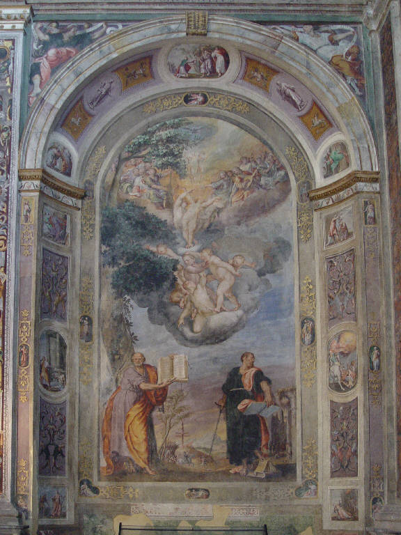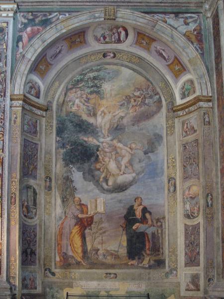 Dipinto murale raffigurante nella parte bassa i due santi Pietro e Paolo, affiancati dalle relative scene dei rispettivi martiri, sormontati da una colonna di angeli senz'ali e nuvole che culmina nella parte alta nella raffigurazione di due nudi umani circondati da angeli musicanti, con le braccia tese verso l'alto in direzione della colomba dello Spirito Santo. Sulla sinistra è dipinto San Pietro, con alle spalle un alto e robusto albero che arriva fino alla sommità del cielo: in mano tiene le chiavi, suo attributo caratteristico, e un libro; sullo sfondo alla sua sinistra, è raffigurata la sua morte avvenuta per crocifissione a testa in giù. Sulla destra è invece raffigurato San Paolo, con in mano una spada, un libro e i piedi appoggiati sopra altri volumi; sullo sfondo, alla sua sinistra, è dipinto il suo martirio, avvenuto per decapitazione presso le mura della città di Roma.