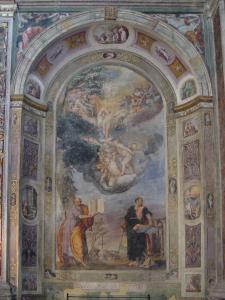 - NOTIZIE STORICO CRITICHE Il dipinto murale è collocato nella prima cappella a destra della Chiesa di S. Vittore, in corrispondenza dell'altare dedicato ai Santissimi Pietro e Paolo, l'ultimo in ordine di tempo ad essere stato realizzato all'interno del complesso. L'opera è stata accostata dalla critica (Tosi, 2014) a Giovanni da Monte, la cui attività è documentata dal 1541: probabilmente originario di Monte Cremasco (presso Como), l'artista fu ampiamente attivo a Milano dove realizzò, tra le altre cose, le ante dell'organo della chiesa di S. Nazaro, raffiguranti le storie dei santi Nazaro e Celso, nonché di Pietro e Paolo. Il presente dipinto è segnalato in bibliografia come confrontabile con la decorazione da lui eseguita nella chiesa di S. Lorenzo a Lodi, che lo impegnò tra il 1566 e il 1568, frutto della forte relazione personale con San Carlo Borromeo e della ritrovata frequentazione con Antonio Campi, dopo una negativa vicenda che li aveva visti contrapposti nella realizzazione di una pala raffigurante la Resurrezione per la chiesa di S. Maria presso S. Celso a Milano. Il rapporto tra i due artisti è caratterizzato da una comune volontà di sperimentazione: pur riconoscendo infatti il ruolo della pittura locale cremasca, Da Monte dovette subito percepire come superata la sua "maniera", e si orientò verso la pittura veneta e la cultura figurativa di Genova, in linea con i desideri delle committenze lombarde.\nPer quanto riguarda il soggetto raffigurato, i SS. Pietro e Paolo sono considerati esponenti fondamentali della storia della Chiesa del I secolo e vengono spesso accostati dall'iconografia e dalla tradizione agiografica. Qui l'enfasi del racconto viene posta sulla storia del loro martirio, raffigurato sullo sfondo alle loro spalle. Sulla sinistra è dipinto San Pietro: il suo vero nome era Simone, poi cambiato da Gesù in "Kefa", che in ebraico significa "pietra" (da cui Pietro), a significare che su di lui avrebbe fondato la Chiesa. Nato in Galilea, egli era un pescatore di Cafarnao che conobbe Gesù tramite il fratello Andrea e venne da Lui chiamato a diventare "pescatore di uomini". Testimone della Trasfigrazione e dell'agonia nel Giardino del Getsemani, cercò di opporsi alla cattura di Cristo ma poco più tardi lo rinnegò tre volte, poi pentendosene amaramente. Fu il primo apostolo ad operare miracoli, a battezzare ed organizzare la Chiesa, pertanto viene identificato come il primo papa. Morì, come rappresentato nel dipinto, a Roma sotto Nerone, tra il 64 e il 67 d.C., crocifisso a testa in giù poichè si considerava indegno di morire come il Signore. Fin dal V secolo viene rappresentato vestito di tunica e pallio, come tutti gli apostoli, e la fisionomia del suo volto prevede capelli corti e ricci e barba ugualmente corta e ispida, secondo la descrizione fattane da Eusebio di Cesarea (secc. III-IV): tra i suoi attributi caratteristici, qui presenti, si annoverano il libro delle sue Lettere ai Romani e le chiavi, simbolo delle chiavi del Cielo che Gesù gli promise quando decise di fondare su di lui la Chiesa terrena.\nSulla destra della composizione appare invece San Paolo: in origine egli era chiamato Saul ed era un fabbricante di tende di Tarso che, subito dopo la morte di Cristo, prese parte alle persecuzioni contro i cristiani. Durante un viaggio verso Damasco, però, ebbe una visione che lo accecò conducendolo alla conversione: battezzato ad Anania si mise a predicare la fede in Cristo fra gravi pericoli, sia per la diffidenza dei cristiani nei suoi confronti, che per il desiderio di vendetta degli ebrei che aveva tradito. Morì a Roma sotto Nerone, intorno al 65 d.C., ma in quanto cittadino dell'Impero non venne condannato alla crocifissione, bensì alla morte per decapitazione, come si vede raffigurato nell'affresco, sulla sinistra della composizione. Anch'egli, come Pietro, viene di norma rappresentato vestito di tunica e pallio, ma di lui Eusebio scrive avesse capelli neri e una lunga barba: tra i suoi attributi, qui presenti, la spada e i libri, in riferimento alle diverse lettere da lui scritte alle prime comunità cristiane.\nLa presente cappella si differenzia dalle altre per la mancata divisione tra parete e lunetta soprastante; si segnala però nel profilo dell'arco la presenza di piccole formelle dipinte in cui sono raffigurate le Virtù Cardinali e Teologali ed alcuni episodi tratti dagli Atti degli Apostoli. Sul fianco sinistro sono dipinte la guarigione dello storpio e degli ammalati (At. 5,15) e Pietro liberato dal carcere da un angelo (At. 12, 1-18), mentre sul fianco destro, la folgorazione di Paolo sulla via di Damasco (At. 9,3-9) e l'uscita del santo da Gerusalemme, dove fu minacciato di morte dai Giudei (At. 23,12-24). Sulla chiave di volta, infine, è dipinto l'episodio di Pietro e Simon Mago (At. 8,9-24). Queste figurette si avvicinano molto ai medaglioni in stucco realizzati nel catino absidale di S. Lorenzo a Lodi, raffiguranti scene della vita e del martirio del santo.