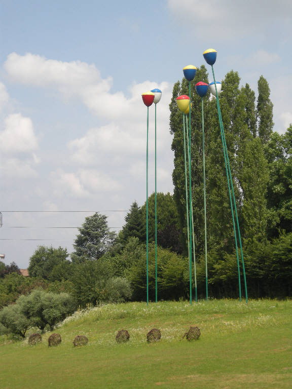 Installazione ambientale costituita da otto pali in acciaio, verniciati di verde, alti dai 20 ai 22 metri, che sostengono una corolla in plastica verniciata di colori sgargianti.