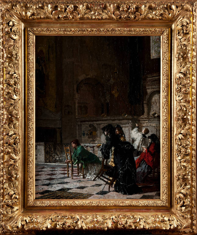 - NOTIZIE STORICO CRITICHE L'opera, firmata da Mosè Bianchi e datata 1872, proviene dalla collezione Federico Gussoni, dove è rimasta fino al 1934, ed è pervenuta alla collezione dei Musei Civici di Monza nel 1989 tramite lascito testamentario di Mauro Primo Barbagli, in memoria di A. Geri, titolari della Galleria Barbagli Geri di Milano.\nLa tela è riconducibile ad una serie di quadri dell'artista dedicati al tema delle donne in preghiera all'interno di una chiesa, che egli amava osservare dal vero, nei quali si scorgono alcuni echi risorgimentali - ad esempio nella scelta di vestire i personaggi di bianco, rosso e verde in richiamo al tricolore -, privi però degli usuali toni pietistici o melensi e caratterizzati invece da una certa solidità dell'impianto e dalla sapiente modulazione delle luci e dei tocchi di colore che vivacizzano la penombra dell'interno. Le donne sono qui restituite minuziosamente sia nelle pose che nelle vesti, in un interessante tributo alla moda del tempo e al suo stesso repertorio iconografico di artista, come rivelano alcuni particolari quali lo scialle verde della donna sulla sinistra e la veletta con cui è coperto il volto della donna in primo piano vestita di nero. Questi soggetti erano infatti già stati dipinti dal Bianchi in precedenza nell'opera "I fratelli sono al campo" del 1869, attualmente conservata presso la Pinacoteca di Brera a Milano (inv. Reg. Cron. 816). Da sempre identificato come un interno del Duomo di Monza, il dipinto in realtà non appare ambientato in una esatta ricostruzione dell'edificio, se non per certi particolari come la pavimentazione e la balaustra: esso pare, più che descritto realisticamente, solo evocato rielaborando in studio suggestioni e tracce lasciate nella memoria da un luogo carico di ricordi, evidentemente a lungo frequentato e dipinto dall'autore.\nLa tela è frutto, come spesso accade nell'opera di Mosè Bianchi, di una lunga serie di studi e disegni preparatori in cui l'artista aveva modo di studiare il soggetto prima di realizzarlo nella versione finale e che dunque testimoniano l'accuratezza della sua modalità creativa. Il suo stile non era infatti dovuto solo all'abilità tecnico-realizzativa ma era una conquista continua, ottenuta attraverso infiniti e necessari controlli sul vero, sul dato reale. Tre dei personaggi - la donna vestita di nero, quella vestita di giallo dietro di lei e il chierichetto intento a spegnere i ceri - sono resi con grande immediatezza in uno schizzo conservato presso il Gabinetto dei Disegni del Castello Sforzesco di Milano (album B33 foglio 16bis); lo "scaccino" è poi ripreso anche in un altro schizzo sempre delle raccolte del Castello (album B33 foglio 29), poi utilizzato come modello nell'acquarello "Studio nel coro del Duomo di Monza" (1874 ca.). La fortuna del soggetto è documentata anche dalla sua ripresa ad acquaforte e acquatinta in diverse versioni, fra cui si citano "Nel Duomo di Monza", di proprietà Goupil&Co. e "Interno del Duomo di Monza", oggi conservato presso la Galleria Nazionale d'Arte Moderna di Roma.