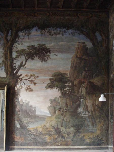 Sala interamente dipinta ad affresco, raffigurante una serie di paesaggi boschivi inquadrati ai lati da grossi fusti d'albero in primo piano che collegano il pavimento al soffitto a cassettoni lignei, fungendo da sostegno ad una finta trabeazione naturale dipinta, che sembra sporgere dal soffitto stesso. Gli alberi dividono in questo modo più scene (bagnanti in un torrente, cacciatori, una rissa di contadini, mulattieri) raffigurate sullo sfondo di paesaggi a tratti rocciosi ed aspri, a tratti collinari e verdeggianti, in cui spesso appaiono elementi acquatici (ruscelli, laghetti, cascate) ed architettonici (mulini, castelli, case rustiche).
