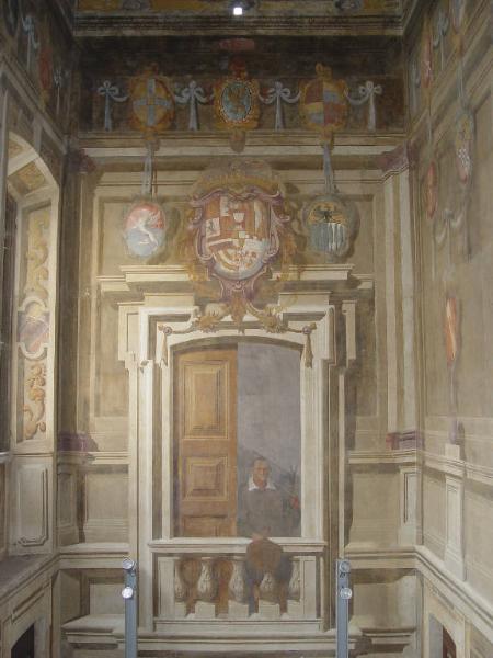 - NOTIZIE STORICO CRITICHE Le pareti affrescate di Palazzo Arese Borromeo costituiscono un'interessante testimonianza dell'araldica lombarda, e attestano l'importanza raggiunta da numerose famiglie nobili che, a differente titolo, vennero a contatto con la realtà cesanese. Lungi da doversi interpretare come sterili elementi decorativi o inutile ostentazione del potere familiare, gli stemmi sono da intendersi, in obbedienza alle rigide norme araldiche, come tasselli di un più vasto conoscere della società sei-settecentesca e delle sue differenti forme di governo. Come ha ricordato Andreina Bazzi in uno studio sugli stemmi araldici presenti in Palazzo Borromeo commissionato da Regione Lombardia all'ISAL, primo elemento metodologico per la loro conoscenza è costituito dalla "loro identificazione", ottenuta attraverso la ricerca di quale posizione le persone insignite ebbero nel casato, che nel Seicento, con Bartolomeo III Arese, raggiunse grande splendore e ricchezza grazie ad un'accorta politica di alleanze matrimoniali e amicizie.\nGli affreschi del secondo scalone per l'accesso al piano nobile (lato sud-ovest), ad esempio, costituiscono un eccezionale esempio per la storia della famiglia Arese Borromeo, che si rispecchia attraverso i suoi stemmi. Sulla parete settentrionale sono raffigurati gli stemmi delle famiglie Archinto, Arese, Visconti, Omodei, Odescalchi e Borromeo. Sulla parete orientale sono presenti invece gli stemmi delle famiglie Legnani, Cusani, Opizzoni, Gallarati, Melzi, Marliani, D'Adda, Corio, Pettenari, Scanzia. La parete meridionale riporta, tra gli altri, gli stemmi delle famiglie Arconati e Ghisolfi, cui si aggiunge lo stemma del re di Spagna e duca di Milano. Infine la parete occidentale riporta gli stemmi delle famiglie Castiglioni, Panigarola, Natta, Caravaggio, Cavenago, Simonetta, Pirovano, Tornielli, Lampugnani, Lurani, Porro, Scotti, Tolentino, Monti, Visconti Borromeo, Grillo, Caccia e Odescalchi.\nTra i molti si ricordano, per le loro particolarità, gli stemmi Omodei e Borromeo, caratterizzati da berrette cardinalizie, e quello Odescalchi, sormontato da una tiara, a testimonianza delle altissime funzioni ecclesiastiche esercitate dai congiunti della famiglia Arese. Bartolomeo Arese aveva infatti sposato Eleonora Omodei, sorella del cardinale Luigi Omodei: da questo matrimonio nacquero un figlio maschio, Giulio, e due figlie femmine, Margherita e Giulia, che verranno maritate rispettivamente con le famiglie Visconti e Borromeo. Notevole è inoltre l'effige dei Cusani, con cinque punti d'oro e quattro di verde sormontato da una corona d'oro antica, inserita in ragione del matrimonio di Elisabetta Cusani con Giberto V Borromeo Arese, ultimo tra i discenti di Bartolomeo ad eseguire lavori all'interno del palazzo.\nSullo scalone sono presenti due date dipinte - 1659 sopra l'ingresso inferiore e 1663 sopra la porta della sala 48 - da intendersi non come gli estremi cronologici di realizzazione della scala ma come un riferimento cronologico simbolico di realizzazione dell'intera fabbrica, racchiusa in un quinquennio.