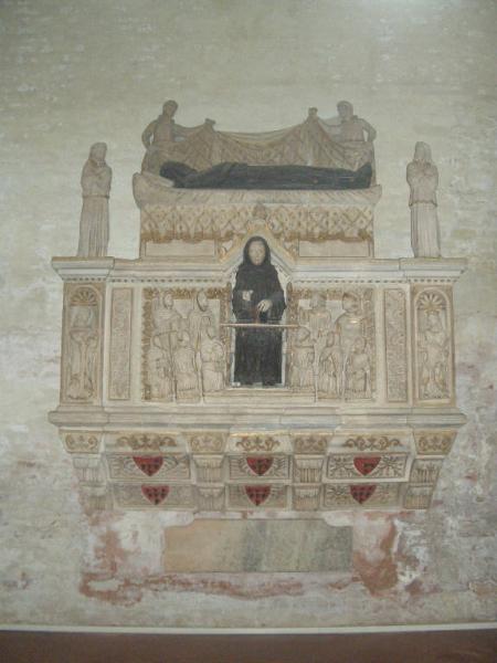 La parte superiore del sarcofago è caratterizzata dalla presenza del defunto, sdraiato su un letto di parata, vegliato da due figure di diaconi con le mani incrociate sul petto alle estremità, mentre altri due personaggi reggono la sua cortina funebre.\nNel frontale del monumento l'agostiniano viene invece rappresentato in cattedra, davanti ad una folla di attenti ascoltatori laici ed ecclesiastici, con ai lati due nicchie all'interno delle quali sono raffigurate Sant'Agnese (a sinistra), con il tradizionale attributo dell'agnello tra le braccia, e Santa Caterina d'Alessandra (a destra), che regge tra le mani un libro e la palma del martirio, mentre a terra compare l'attributo della ruota dentata. \nIl frate risulta in entrambe le rappresentazioni ancora dotato dell'originaria policromia della scultura, caratterizzata da un saio nero punteggiato di stelle dorate che richiamano la medesima doratura ancora parzialmente visibile nei fregi sottostanti.