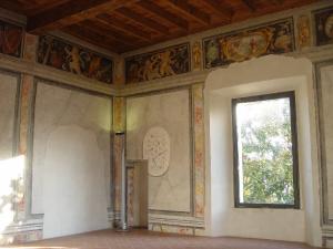 Collocata al secondo piano del complesso, la stamza è caratterizzata dalla presenza di un raffinatissimo fregio dipinto che corre sulla sommità delle quattro pareti, a contatto con le travature lignee del soffitto. I singoli riquadri, di forma rettangolare stretta e allungata, nel numero di tre per parete, sono occupati ai lati da muscolosi putti alle prese con animali esotici o mostruosi, oppure affiancati da strumenti musicali di differente genere. Nel riquadro centrale invece, è raffigurata all'interno di una cornice dorata anch'essa circondata da strumenti musicali o suppellettili del mondo antico, una scena simbolica. Due di queste sono a soggetto sacro (San Gerolamo nel deserto e lo sposalizio mistico di Santa Caterina), mentre altre due rimangono più misteriose, un viandante che cammina in mezzo alle montagne e un lupo che ulula con una città in lontananza. Tali riquadri sono separati l'uno dall'altro da un sottile inserto in finto marmo dipinto, oppure da una nicchia affrescata con all'interno una statua dorata di eroine ebree e pagane. La parte centrale delle pareti è dipinta in modo tale da ricreare una superficie in finto marmo con al centro una finta decorazione marmorea ad intarsio, riproducente sottili motivi ornamentali floreali.