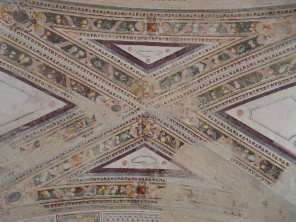 Il soffitto della navata centrale si presenta diviso in campate strette e allungate, coperte ognuna da una volta a crociera affrescata con motivi decorativi vegetali. Ogni vela della crociera è caratterizzata da un profilo esterno decorato con un motivo ad ovoli dorati, che racchiude al suo interno un ricco festone di foglie e frutti, avvolto da nastri colorati che termina, in corrispondenza degli angoli, con delle ricche cornici contenenti specchi-gioiello. Gli archi che separano le singole campate sono anch'essi decorati ad affresco con motivi geometrici, intervallati da riquadri figurati oggi di impossibile interpretazione a causa dello stato di conservazione della pellicola pittorica.\nNella parte di chiesa aperta ai fedeli tale decorazione è stata in parte modificata, se non nell'impostazione generale, almeno nei dettagli. Rimane infatti presente il motivo a festone vegetale, circondato però da cornici architettoniche lisce che agli angoli termina con volti dorati di putti. Inoltre il triangolo centrale di ogni vela, caratterizzato nella chiesa claustrale da una semplice riquadratura con tre rosette dorate alle estremità, viene qui sostituito da un motivo decorativo ad ondine dorate.