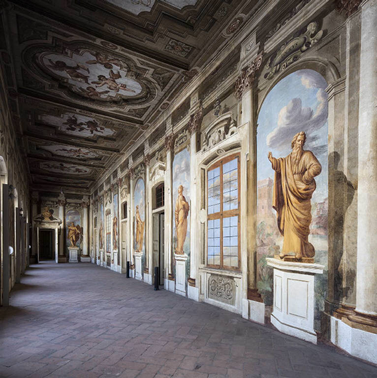 - NOTIZIE STORICO CRITICHE L'ala meridionale del piano nobile del palazzo era in origine dedicata ad un vasto programma di sapienza sacra e profana, collegato all'originale funzione delle stanze come residenza e luogo di educazione del giovane conte Giulio II Arese. L'asse portante di tutti gli ambienti è costituito dalla Galleria delle statue, in cui evidenti appaiono le valenze culturali espresse nel ricco apparato di affreschi parietali della sala, che un tempo doveva essere popolata anche da molte statue (da cui la denominazione), di cui gli inventari settecenteschi ci restituiscono solo elenchi generici, ma che dovevano comprendere sculture di piccole e grandi dimensioni, probabilmente sia di epoca antica che moderna. \nRispetto alla zona del Ninfeo e al quartiere di stanze dedicate alla scienza naturale e all'astronomia, dove la tipologia di sapere cui tendevano gli Arese era una sorta di conoscenza dei segreti del cosmo e delle forze della Natura, in questa sala prevale il sapere scolastico e la razionalità data dall'applicazione di nome didattiche e non misteriche: secondo quando dipinto sulle pareti lo studio e la metodologia aristotelica condurranno il giovane allievo Arese ad impadronirsi di tutte le scienze e le arti, seguendo l'esempio dei grandi filosofi e studiosi del passato, ma sviluppando anche la capacità di coniugare la propria intelligenza innata con le abilità operative di cui era dotato l'imperatore Cesare. La fonte primaria delle decorazioni raffiguranti i campi del sapere umano è l'"Iconologia" del perugino Cesare Ripa (1555/60-1622), stampata per la prima volta a Roma nel 1593. Il testo, fra i più noti nel Seicento, forniva ai suoi lettori un utile repertorio di immagini simboliche descrivendo, in ordine alfabetico, le personificazioni di concetti astratti (virtù, vizi, affetti e passioni umane) contraddistinte da precisi attributi e colori simbolici.\nUn'iscrizione dipinta sulla porta d'accesso che conduce allo Scalone meridionale reca la data 1663, da intendersi come l'anno di inizio dei lavori di decorazione della sala, in onore degli studi intrapresi dal giovane conte. La sua morte improvvisa nel 1665, fece tuttavia apportare una serie di modifiche nelle ultime due campate della sala e, in particolar modo, sulla volta, dove i putti lasciano cadere le Ali simbolo della famiglia Arese e gli stemmi loro collegati vengono sostituiti con quelli dei Borromeo, nuovi eredi di Bartolomeo III Arese.\nPer quanto riguarda l'autografia di tale complessa struttura dipinta, la critica ha tratto dagli inventari settecenteschi il riferimento a differenti mani, poi identificate in quelle del pittore Antonio Busca, probabile autore delle decorazioni sulla volta; dei fratelli Giovanni Stefano e Giuseppe Doneda, detti i Montalto, per la realizzazione delle figure allegoriche; dell'artista Giovanni Ghisolfi, per la quadratura architettonica di fondo.