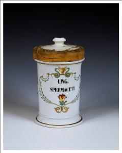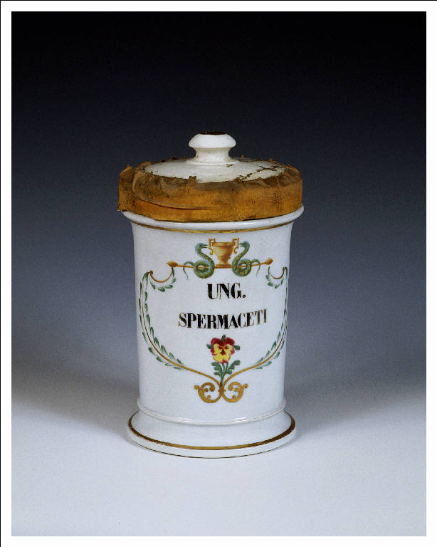 Contenitore con corpo cilindrico caratterizzato da lieve strombatura alla base; la bocca è svasata per permettere l'appoggio del coperchio, che presenta bordo dritto e presa a pomello schiacciato.