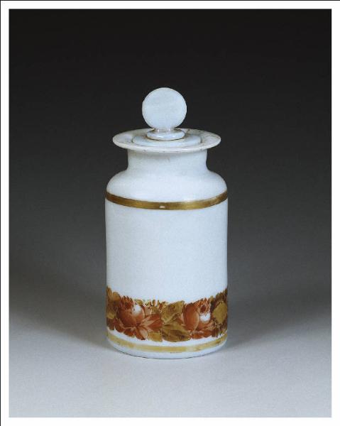 Contenitore da polveri con corpo cilindrico dritto su piede piatto; il collo è stretto e alto; l'ampia bocca dall'orlo estroflesso è predisposta per il largo tappo tondo con presa a ventaglio.