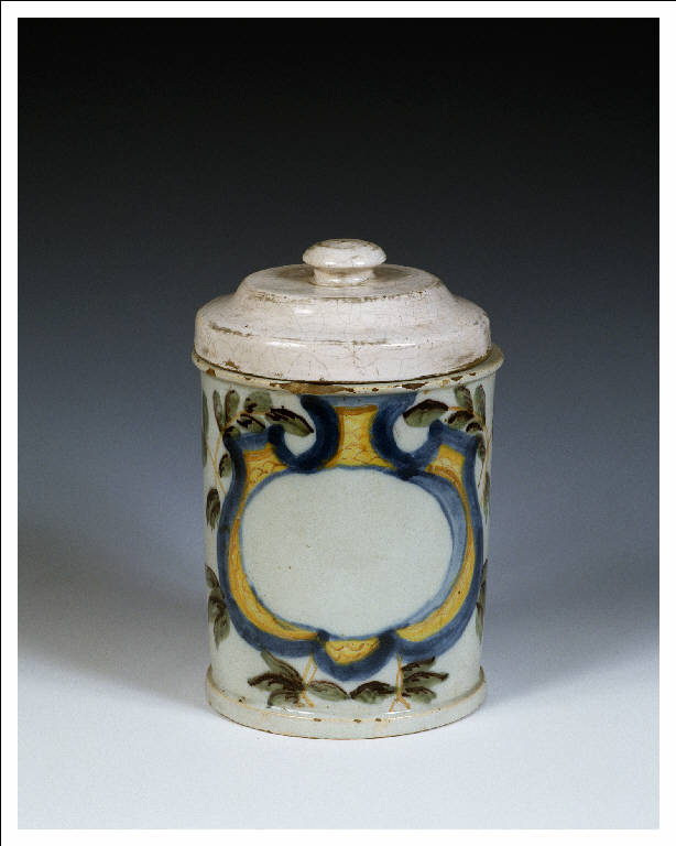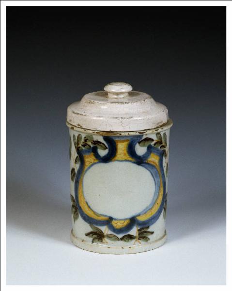 Contenitore con corpo cilindrico, base piata e bocca chiusa da coperchio degradante a pomolo piatto.