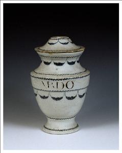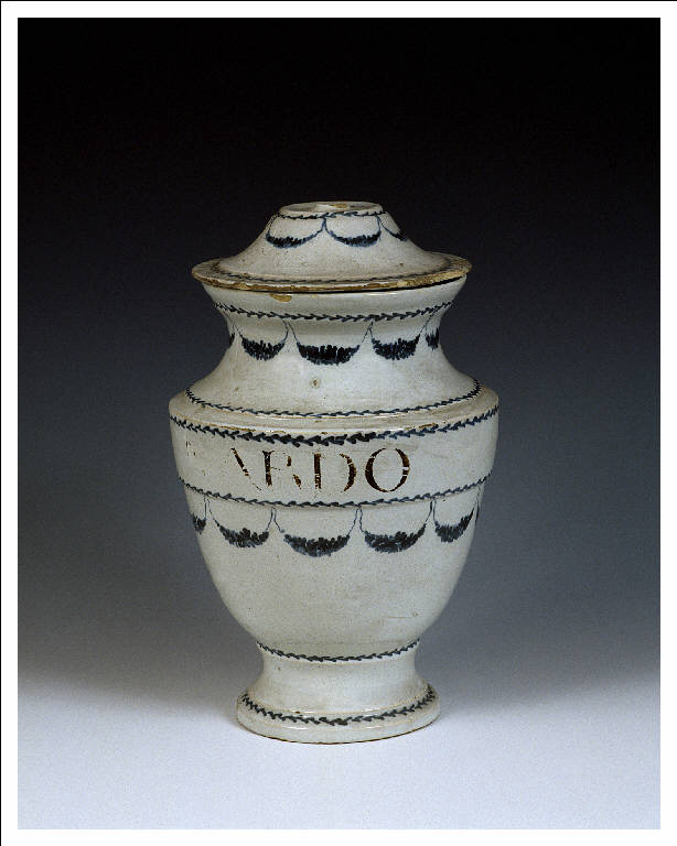 Contenitore con corpo a balaustro su alta base digradante; l'ampio collo svasato è chiuso da coperchio ad incastro con pomolo.