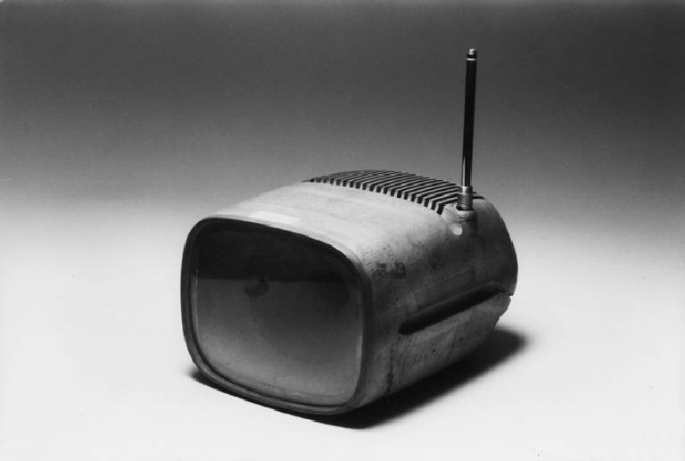 Modello di studio per televisore portatile monoblocco dalla caratteristica forma cilindrica a base ellittica.