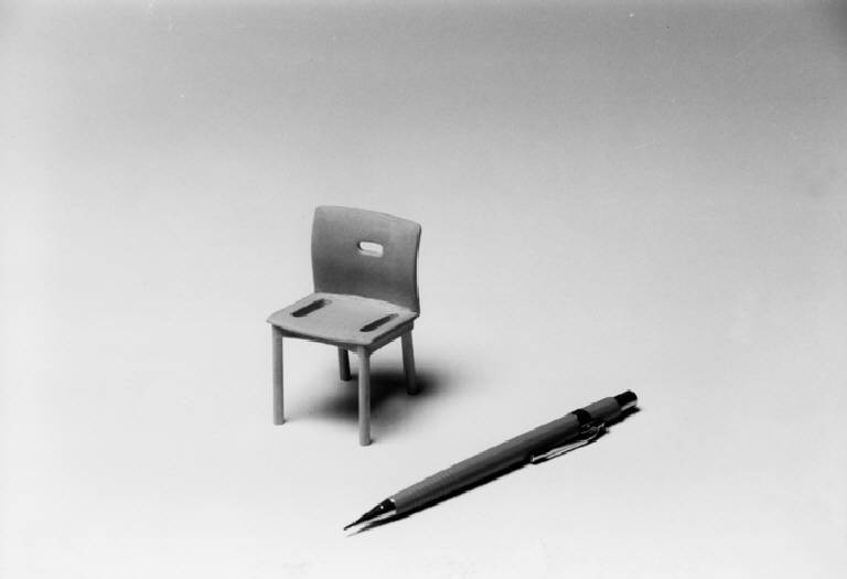 Modello di studio per la miniatura della sedia di produzione Kartell modello 4870, da utilizzare come oggetto omaggio aziendale. E' composta da gambe cilindriche a sezione circolare costante, sorreggenti le lastre leggermente curve che realizzano la seduta e lo schienale. La struttura è inoltre resa più stabile da quattro travetti, posti sotto il piano di seduta, che collegano le gambe.