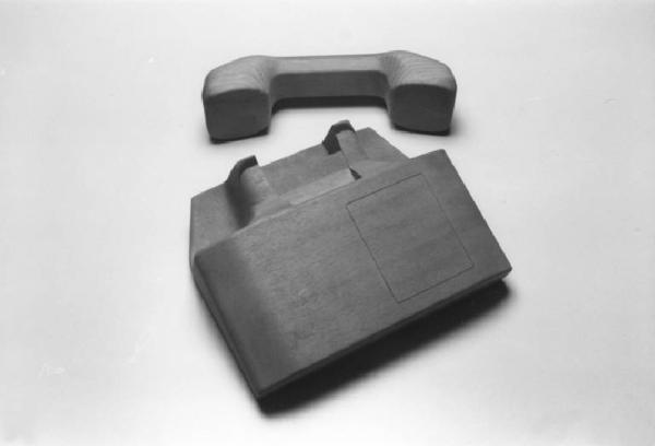 Modello di studio per telefono da tavolo composto da una cornetta telefonica di forma tradizionale e da un corpo prismatico a pianta trapezoidale nella quale è contenuta la tastiera numerica per la selezione dei numeri e la forcella per agganciare la cornetta. Il piano contenente la tastiera è leggermente inclinato al fine di favorire la digitazione dei numeri.