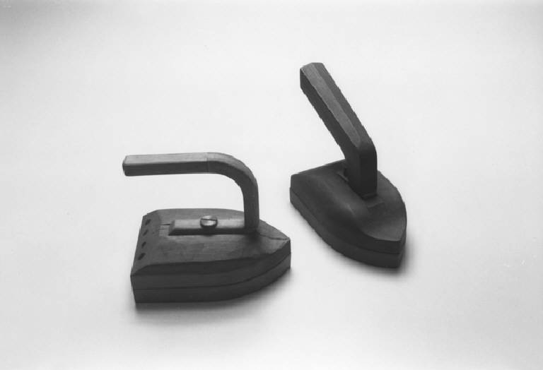 Modello di studio tradizionale a piastra senza caldaia interna. Il modello di sinistra è un solido prismatico a pianta parabolica al quale è fissato nella faccia superiore il manico realizzato con un listello a sezione quadrata curvato a forma di U. (per la descrizione del modello di destra vedasi scheda 340)