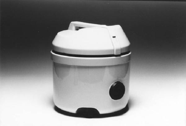 Modello di studio per apirapolvere composto da un corpo cilindrico sormontato da un coperchio con maniglia.