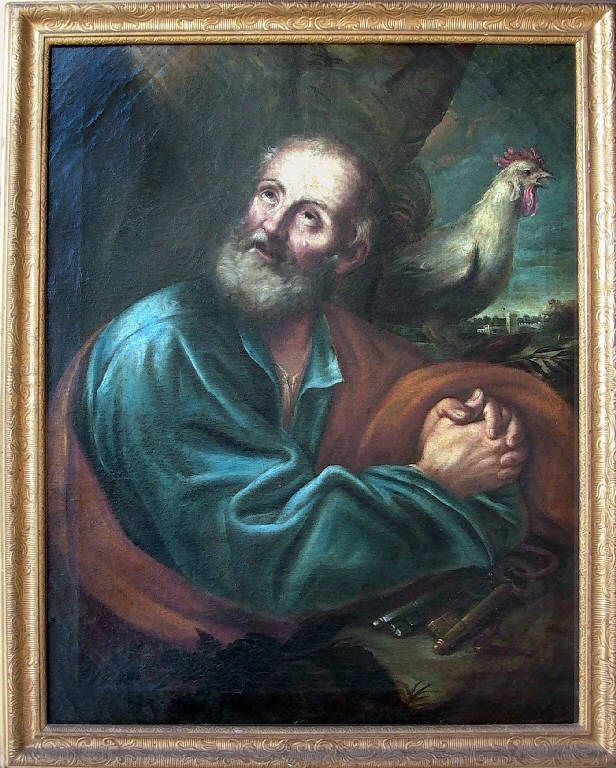- NOTIZIE STORICO CRITICHE Il pentimento di san Pietro, avvenuto durante la notte nella quale Cristo viene catturato e condannato a morte, è uno dei temi preferiti dalla pittura di devozione di epoca controriformistica. Come descritto da Terraroli, in questo dipinto entrato in Pinacoteca grazie al lascito di Marianna Rota nel 1926, insieme alla figura del santo, piangente in primo piano, sono visibili le mura della città di Gerusalemme, un gallo, ricordo della profezia di Gesù, e un gregge di pecore, memoria del perdono ottenuto da Pietro dopo la risurrezione di Cristo quando questi, chiedendogli per tre volte se lo amasse, gli affidava la Chiesa sotto la figura di pecore e agnelli da pascere. Attribuita da Terraroli, che la pubblicava per la prima volta, a un pittore lombardo della seconda metà del XVII secolo, la tela dev'essere invece considerata opera di artista bresciano della prima metà del secolo successivo, non distante dalla pittura facile e schiarita di Giovanni Antonio Cappello o di Antonio Dusi, e comunque già influenzata (specie nella figura del santo) da un certo richiamo alla cultura classicista di marca bolognese ben attestata in Brescia già a partire dall'opera di Francesco Paglia.