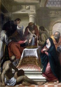 - NOTIZIE STORICO CRITICHE Dopo il restauro del 1996 il dipinto ha riacquistato la smagliante gamma cromatica tipica dell'artista e ha permesso a Angelo Loda di approfondire i nessi stilistici tra quest'opera e l'intera attività artistica del Giugno a partire proprio dalla Circoncisione (firmata e datata 1608), conservata nel presbiterio della chiesa bresciana di Santa Maria delle Grazie. La tela entrò in Pinacoteca prima del 1917, quando Rivetti l'attribuì a Palma il Giovane e con tale attribuzione fu tenuta anche da Lancini. Solo Terraroli ha ricondotto l'opera al Giugno in base a criteri stilistici, avvalorati grazie all'approfondimento di Loda dalla menzione del dipinto, seppure con il titolo errato di Presentazione al tempio, nel Giardino della Pittura di Francesco Paglia che lo vedeva nella sua collocazione originaria nel distrutto oratorio del Santo Nome di Gesù (detto del Rosso per il colore della cappa indossata da questi confratelli; Rivetti L., 1925, p. 83) di Chiari dal quale fu rimosso in epoca imprecisata e, dopo un periodo di deposito presso la parrocchiale di Chiari fu depositato in Pinacoteca dove figura, già dall'Inventario del 1918 come opera di proprietà della Fabbriceria Parrocchiale. Cronologicamente il dipinto, come ha osservato Terraroli (1991, p. 28) è assegnabile agli anni 1615-1620, in concomitanza con la realizzazione di altre opere per Chiari come la pala raffigurante la Madonna con il Bambino e i santi Faustino e Giovita, un tempo pala dell'altare maggiore della parrocchiale e oggi nella Pinacoteca Repossi (inv. n. D00043) e due tele raffiguranti San Diego d'Alcalà e Sant'Antonio da Padova (quest'ultima firmata) per la chiesa francescana di San Bernardino. Lo stile del Giugno in quest'opera rivela la forte dipendenza dell'artista dalla maniera di Palma il Giovane "in particolare [nel]l'ignudo in primo piano, la minuzia descrittiva del ricamo della tovaglia e delle frange del kilim sottostante, l'ambientazione chiesastica di taglio classicista" (Loda, 1996, p. 14). Qui, poi, l'artista, si rivela meno debitore alla sintassi manierista che caratterizza la scena dipinta per la chiesa di Santa Maria delle Grazie a Brescia e concepisce la scena con un rigoroso impianto piramidale che rende più compatta la composizione e conferendole un tono di maggiore intensità devozionale, coniugato con un più equilibrato sentimento del colore la cui brillantezza è giocata attraverso accordi chiaroscurali sapienti e ricchi di variazioni atmosferiche.
