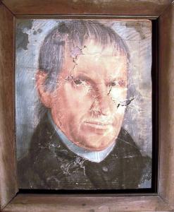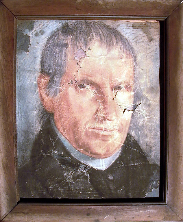 Ritratto in primo piano girato di tre quarti verso destra di don Tommaso Begni; indossa un cappotto nero, l'abito talare ed il collarino bianco; i capelli sono grigi e lisci.