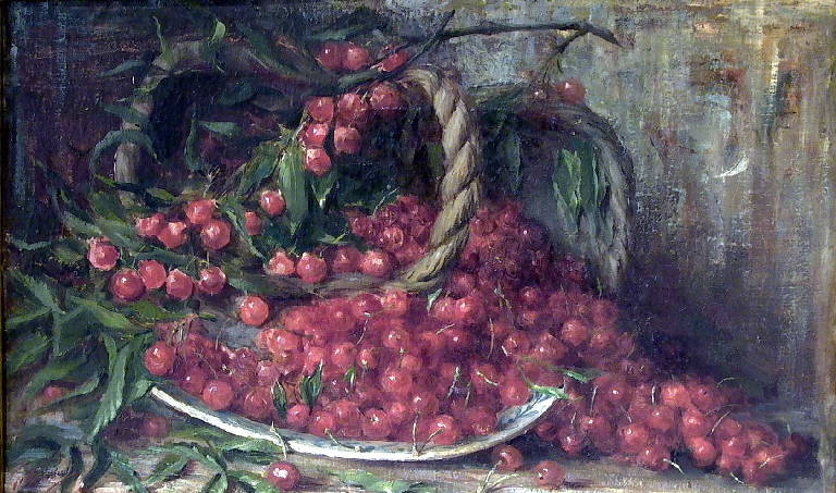 In primo piano al centro, appoggiato su un piano, si vede un piatto ovale bianco con decori blu dietro il quale si trova un cesto in vimini, anch'esso di forma allungata e con il manico; tale cesto è rovesciato su un fianco e da esso sono uscite le ciliegie che riempiono il piatto e ricadono anche sul piano d'appoggio. Insieme alle ciliegie vi sono anche le foglie.