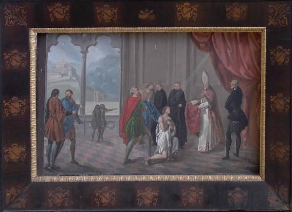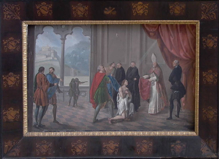 - NOTIZIE STORICO CRITICHE Per le notizie storico-critiche si rimanda alla scheda dell'opera inv. n. D00105. Solo poche differenze caratterizzano questo dipinto rispetto all'altra versione. Le più macroscopiche riguardano il panno tenuto dal vescovo che qui è di colore rosso e la figura del padre di Francesco in posa più raccolta e remissiva. Di un certo interesse la presenza sullo sfondo del castello di Brescia che sostituisce una veduta del tutto generica.