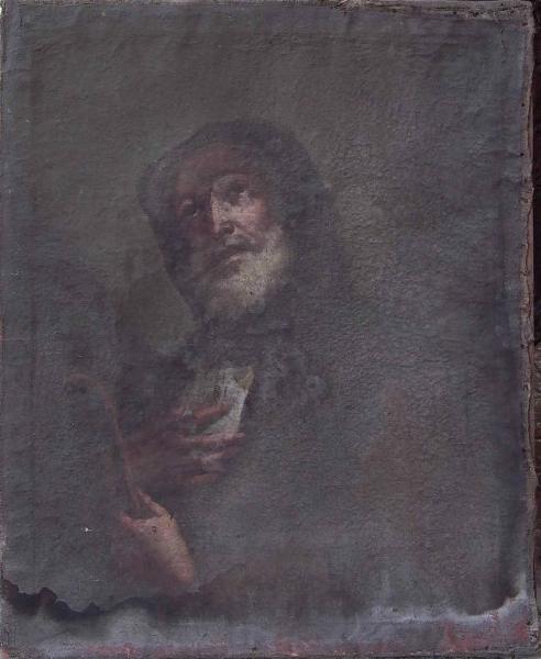 - NOTIZIE STORICO CRITICHE Il pessimo stato di conservazione del dipinto non permette di dare un giudizio preciso sull'opera; la figura del santo che emerge dal fondo scuro è resa con una pennellata veloce e liquida che lascia pensare a un manufatto realizzato in ambito locale entro la prima metà del Settecento.