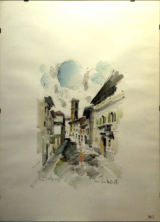 - NOTIZIE STORICO CRITICHE Simile alle altre vedute delle strade del centro storico, la via Matteotti si orienta naturalmente verso l'alta massa del campanile che si intravede alla fine del percorso. Costante la ricerca di imprigionare in pochi elementi, velocemente schizzati, i caratteri salienti degli edifici e dei monumenti.