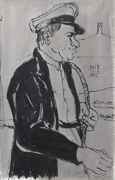 - NOTIZIE STORICO CRITICHE Ripresa quasi caricaturale, o almeno vignettistica di un personaggio conosciuto a Chiari alla metà degli anni Cinquanta, questa figura, colta di profilo e torreggiante sull'essenziale veduta dello sfondo esprime anche attraverso l'uso abbondante della china e una maggiore definizione volumetrica il senso di ambigua potenza di questo accalappiacani, una sorta di semi divinità a misura di animale.
