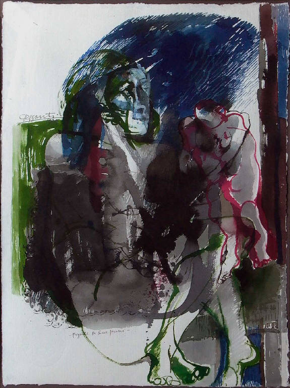 - NOTIZIE STORICO CRITICHE Nel corso degli anni Settanta la ricerca sulla figura e sulla sua collocazione in spazi virtuali, costruiti dalla sola mente dell'artista, diventa uno dei temi preferiti da Dessanti. In quest'opera, segnata da ampi segni realizzati con inchiostri colorati, le figure sembrano intersecarsi e ricevere significato le une dalle altre per via di dissonanza sia cromatica che tematica. Ancora si intravede il tema dell'attesa al quale è ora connesso quello dell'abbraccio e della dimensione affettiva.