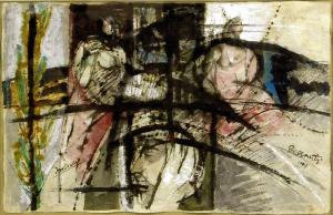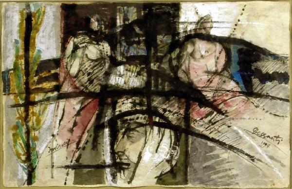 - NOTIZIE STORICO CRITICHE Punto di sintesi dell'intera opera pittorica di Dessanti, i dipinti degli anni Novanta costituiscono una sorta di bilancio della sua intera attività. In questo dipinto si nota la consueta riduzione a forme geometrizzanti e quasi astratte delle figure e la loro organizzazione entro reticoli e scacchiere ben definiti. A questo si aggiunge una maggiore libertà nel tratto e nell'accostamento cromatico. Più che altrove qui si nota un articolarsi severo attorno alla maglia portante della costruzione che assume quasi i contorni della vetrata antica.