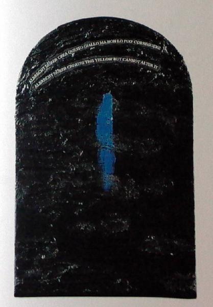 Su un supporto centinato e di colore nero si trova una pennellata blu ed il titolo a lettere stampate, sia in italiano che in inglese.