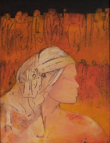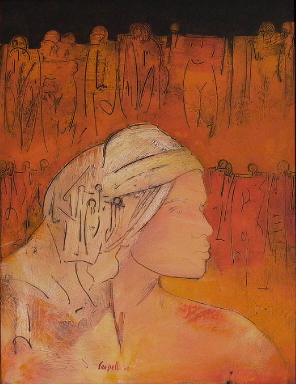 - NOTIZIE STORICO CRITICHE Alla produzione recente appartiene questo ritratto di Paola, dipinto dai toni caldi e dagli echi esotici. La figura campeggia al centro del dipinto e si distingue dal resto della figurazione per la diversa cromia. Importante in questa fase del percorso di Cropelli è l'uso di segni incisi nel colore che fungono da trascrizioni stenografiche degli elementi che compongono il suo mondo poetico. Alle complicate immagini simboliche degli anni Ottanta del Novecento si sostituisce - ma ne è direttamente figlia - questa nuova visione delle cose intuite e rilette nella loro capacità di suggerire e richiamare.