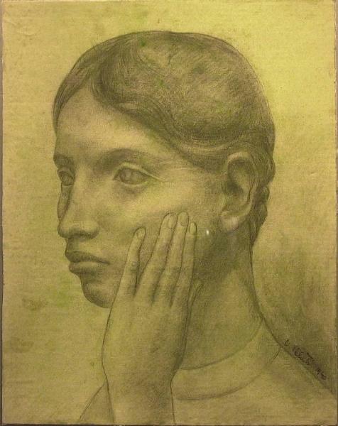 Ritratto in primo piano di tre quarti girato verso sinisra di una donna; la mano destra è appoggiata alla guacia destra.