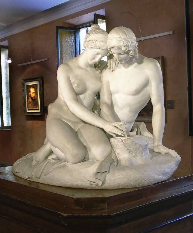 - NOTIZIE STORICO CRITICHE Tema desunto dall'Orlando Furioso, certamente uno dei temi più amati e rappresentati nell'arte italiana dell'Otto e Nocevento, in quanto permetteva di collocare una scena galante in un paesaggio boscoso e con due protagonisti adolescenti. Il gruppo è pervenuto nelle raccolte della Pinacoteca attraverso il lascito, nel 1854, dell'avvocato Pietro Bartolomeo Repossi. Opera dell'attività estrema del ravennate, incarna gli ideali della statuaria neoclassica a tutti gli effetti consacrato dalla corrente arcadica e amato per la sua vena a metà tra il sottinteso erotico e il languore amoroso. L'alto magistero canoviano è ben visibile nella languida morbidezza delle due figure e nell'intensità psicologica raggiunta dall'artista nel delineare il fragile sentimento dell'innamoramento giovanile. Seppur di disegno perfettamente classico, il profilo di Angelica non accenna alla rigida freddezza che si rintraccia nella Filologia del Monumento a Stefano Antonio Morcelli nella parrocchiale di Chiari, opera dello stesso Monti. Anche se stilisticamente la figura di Medoro è accostabile al celeberrimo Galata morente, noto attraverso diverse copie di età romana, mentre quella di Angelica pare riferirsi vagamente all'Afrodite al bagno, pure conosciuta attraverso copie romane e divenuta nel Rinascimento esempio di nitore della statuaria classica, i due giovani sono trattati da Monti con una sensibilità tutt'altro che antiquaria, mantenendo quel senso di pura sensualità che dovette affascinare lo stesso Repossi, come testimonia il dipinto che lo ritrae seduto allo scrittoio con alle spalle proprio questo gruppo marmoreo.