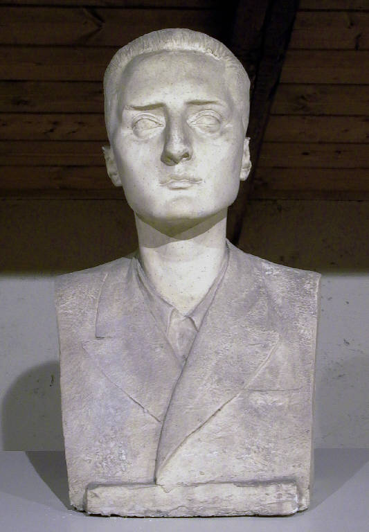 Busto di giovane visto frontalmente con giacca doppio petto e camicia dal collo aperto; i capelli sono ordinatamente petinati all'indietro.