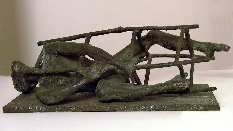 - NOTIZIE STORICO CRITICHE Tra le opere più drammatiche dell'artista, questo bronzetto ripropone il dramma della caduta e dell'atterramento. Il corpo dell'uomo, privo di connotati specifici, è steso a terra; sopra di lui, riversa, la sedia dalla quale è caduto che funge figurativamente anche da gabbia e da prigione. In questa, come in figure analoghe, l'artista presenta la frustrazione della sconfitta e l'ineluttabilità della sorte. Le figure sono trattate con un modellato robusto; la corporatura in bella evidenza mostra una maturazione nella plastica di Pelati che si evolve verso forme più aperte e aeree seppure al momento ancora imprigionate in dolorosi e annullanti contorcimenti. L'opera è stata donata alla Fondazione dalla sig.ra Iris Polidori vedova dell'artista Vittorio Pelati come volontà testamentaria; deceduta la sig.ra Iris nel 1999, tale opera è giunta in Fondazione nel 2002.