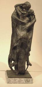 - NOTIZIE STORICO CRITICHE Dal blocco ideale nel quale il bronzetto è plasmato emergono gli elementi essenziali della composizione: le braccia, le gambe, i visi legati dal bacio. L'uomo, nell'ampio mantello, abbraccia e copre la donna dalle membra scattanti. Il gruppo è un grumo di tensioni contrastanti, come l'indagine psicologica messa in atto da Pelati, e di elementi che, formalmente, si negano mettendo in contrapposizione zone levigate e profondi chiaroscuri, una modellazione piana e l'improvviso intaglientirsi di alcuni particolari. Oltre ai consueti modelli e punti di riferimento dell'artista, pare legittimo qui scorgere anche la presenza - nella monumentalità sgranata - di Giacomo Manzù.
