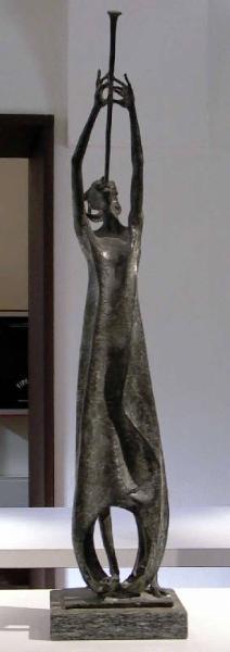 - NOTIZIE STORICO CRITICHE Le forme stilizzate, utilizzate dall'artista qualche anno prima in opere come Comunità religiosa (inv. n. S00118) fino ad assumere connotati quasi astratti, sono utilizzate in parte anche in questo bronzetto più tardo. In esso, però, l'elemento di grazia affusolata e la stilizzazione formale non abbandonano i tratti e le forme umane inserendosi nel progressivo processo di riduzione della figura a cifra decorativa che sarà tipico delle ultime opere. Anche qui il modellato si mostra addolcito e vibrante per lasciare alla luce la possibilità di distendersi ampia sulle lunghe superfici modellate a semplici piani arrotondati.