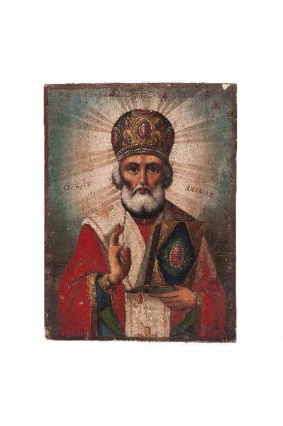 - NOTIZIE STORICO CRITICHE San Nicola di Mira, nel nostro esemplare, è ritratto in una grande aureola a raggiera, su uno sfondo azzurro-blu sfumato. Egli è in posizione frontale, nella caratteristica rappresentazione a busto, benedicente con la mano dx secondo il gesto trinitario, mentre con la sinistra regge il libro del Vangelo chiuso da una coperta riccamente decorata a losanga centrale con dipinto un grande rubino ovale. Il volto, dai grandi occhi assorti, dal naso lungo fino alla radice sopracciliare, dai capelli, barba e baffi bianchi, sembra contemplare l'Infinito. San Nicola è rivestito, secondo la sua carica e secondo la liturgia ortodossa bulgara, dei paramenti vescovili: porta la mitra senza croce, copricapo che emula il diadema d'oro incastonato di pietre preziose (rubini e zaffiri) dell'Imperatore costantinopolitano e che è stato introdotto nell'episcopato orientale solo nel XV secolo; il santo vescovo indossa lo sticharion blu coperto da un ampio manto rosso, orlato ad una greca d'oro, su cui ricade l'omophorion bianco ricamato a fiori giallo-dorati.