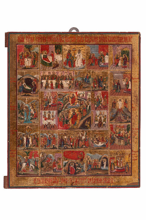 - NOTIZIE STORICO CRITICHE Tempere all'uovo coloratissime e lacche su fondo oro, crisografia e fine graffito esaltano le splendide miniature di questa tavola (sec. XVIII) della scuola iconografica russa di Nev'jansk.\nAl centro della tavola è raffigurata l'icona della Pasqua secondo la tradizione russa in uso a partire dal XVI secolo: il Cristo, in una mandorla d'oro, sorge dal sepolcro in alto e, sotto, discende nell'Ade, ove riscatta Adamo, Eva e gli altri Giusti dalle fauci infernali. \nDue serie concentriche di miniature rappresentano, le esterne, le Sedici Grandi Feste della Chiesa Ortodossa, mentre le interne i momenti più significativi della Santa Settimana di Passione. Le scene si leggono da sinistra a destra, (per chi guarda) cominciando dall'alto.\nNel ciclo esterno sono rappresentate le 16 grandi feste: \nTrinità del Vecchio Testamento / Natività di Maria / Trinità del Nuovo Testamento\nPresentazione di Maria al tempio / Annunciazione / Natività di Cristo / Presentazione di Cristo al tempio / Battesimo di Cristo (Teofania) Trasfigurazione sul monte Tabor / Ascensione / Dormizione della Vergine / Ingresso in Gerusalemme\n/Decollazione di San Giovanni Battista / Protezione della Madre di Dio (Pokrov)/ Resurrezione di Lazzaro / Esaltazione della Croce\nNel ciclo interno sono celebrate le scene della Passione: Lavanda dei piedi / Ultima cena / Cristo nell'orto del Getsemani /Bacio di Giuda\nCristo viene portato da Caifa / Cristo viene portato da Pilato / Cristo viene flagellato / Cristo viene incoronato di spine / Cristo sale al Golgota con la croce / Viene crocifisso /Viene deposto dalla croce / Cristo viene sepolto..
