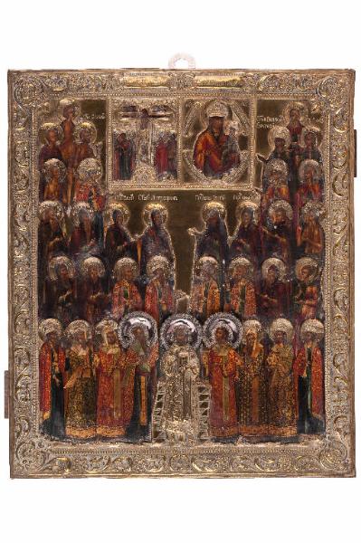 - NOTIZIE STORICO CRITICHE Nella chiesa dei primi secoli, la sinassi (dal gr. Sýnaxis: adunanza) era la riunione dei fedeli per la lettura dei libri sacri e per la celebrazione eucaristica adunanza. L'icona commemora alcuni santi, celebrata nel giorno successivo a quello di una festa importante di cui sono stati coprotagonisti. Sinassi dunque allude alla presenza di un gruppo di persone (angeli, santi e sante, metropoliti e monaci¿) che attorniano una raffigurazione centrale. La nostra icona, di Scuola Russa di Palech (?), risalente a fine XVIII - inizi XIX secolo, è scritta, a tempera all'uovo e lacche con ricca e finissima crisografia, su tavola lignea. Su tre registri, ecco, suddivisi per otto, asceti (scarni e seminudi) metropoliti egumeni, monaci, vescovi, riconoscibili dalle ricche e sontuose vesti e dai simboli liturgici (tiare, vangelo in mano, omophorion), sono leggermente volti, quattro da una parte e quattro dall'altra, verso il centro, in atteggiamento di preghiera e di invocazione; gli otto più in basso hanno al centro la figura di san Nicola ritratta frontalmente con tutti i simboli del suo status. Al centro, sopra le tre file, due icone affiancate rappresentano rispettivamente la Crocifissione e la Madre di Dio "avvocata dei peccatori" ; ai lati di queste, in forma piramidale, cinque da una parte e cinque dall'altra, santi e sante, eremiti ed asceti tutti oranti e invocanti si volgono verso il Crocifisso e Maria "avvocata". La Crocifissione è rappresentata secondo i canoni tradizionali: al centro, Cristo crocifisso; il volto, dagli occhi chiusi, reclinato sulla spalla destra e circonfuso da un nimbo aureo crociato; alla sua dx e alla sx sono rappresentate la lancia e la canna con la spugna imbevuta d'aceto, chiari richiami ai testi evangeli della Passio, in piedi, ricoperte dal maphorion e col capo aureolato d'oro, Maria di Magdala e Maria di Cleofa sorreggono la Madre di Dio, che è in atteggiamento di abbandono e dolore; a sx della croce Giovanni apostolo, con le braccia che alzano verso Gesù il Vangelo aperto, mentre il centurione romano Longino, lancia nella mano sx, è in contemplazione del Cristo: anche lui ha un nimbo d'oro intorno al capo, simbolo della sua conversione. Sotto la croce un teschio con due tibie incrociate, rappresentazione che si collega alla credenza, diffusa a partire dal medioevo, che la Croce fosse stata piantata proprio sopra la tomba di Adamo, a significare il riscatto del peccato originale. Sullo sfondo le mura di Gerusalemme.\nL'icona della Crocifissione è affiancata da quella della Madre di Dio, "Garante dei peccatori", molto cara alla pietà dei fedeli della Chiesa russa. Il nome slavo molto antico nella liturgia e nel pensiero mariologico orientale che porta l'icona [= Sporoutcnitsa gresnych], può essere tradotto non solo con quello di"Garante" ma anche con quello "Avvocata dei peccatori"-. L'icona appartiene al tipo generico dell'Odigítria: la Madonna vi è raffigurata in busto, regge il divin Bambino sul braccio sinistro e lo indica con la mano destra leggermente sollevata. Il tipo contiene però, in questa icona, alcuni particolari che la rendono immediatamente riconoscibile al fedele che la guarda: anzitutto, la Madonna è quasi incorniciata da una specie di ovale, disegnato tutt'attorno al busto e formato da una scritta in slavo suddivisa in quattro parti e contenente la seguente promessa, posta in bocca della stessa Madonna che dice: "Io sono garante dei peccatori presso mio Figlio; questi mi ha promesso, dandomi la mano,di ascoltare la mia difesa per quanti mi procurano gioia, chiedendo di allietarsi in eterno attraverso di me". Come per confermare le parole della Madre, il Bambino, seduto maestosamente sul suo braccio sinistro, appoggia tutte e due le manine sul braccio destro di Maria. Altra caratteristica, è costituita dalle corone poste sui capi di Madre e Bambino: vi si ravvisa una probabile influenza occidentale della Madonna incoronata. \nIl raduno (sinassi) fa pensare che tutti insieme, santi e sante intorno a Cristo in croce e a Maria intercedente, partecipino alla redenzione a e alla salvazione dell'umanità \nOklad e nimbi in metallo dorato sbalzati, incisi e cesellati impreziosiscono l'icona. Tre nimbi in argento stampato sono stati applicati posteriormente. Punzoni dell'argentiere I D, in lettere latine corsivo maiuscolo, I. Danishyevsky (l''unico argentiere registrato con queste iniziali in latino), attivo a Vilnius dal 1844 al 1893.