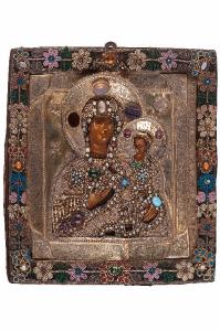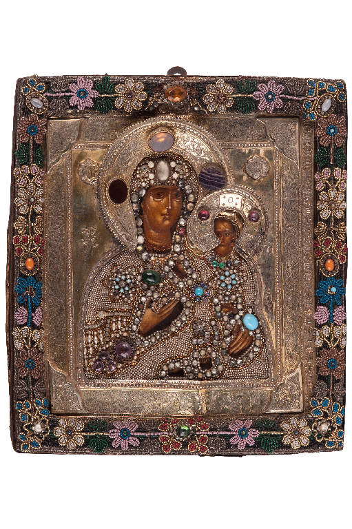 - NOTIZIE STORICO CRITICHE La Madre di Dio di Smolensk è l'icona russa che più di qualsiasi altra riproduce il tipo classico della Hodighitria bizantina ("Colei che indica la Via"). La tradizione la vuole attribuita al pennello di San Luca, come pure il prototipo della "Umiliene" ossia la Madre di Dio della tenerezza: in entrambe l'Evangelista avrebbe ritratto Maria, garantendo la "fedeltà" della raffigurazione iconografica e la "somiglianza" autentica. La prima icona Smolenskaja si dice sia stata portata in Russia da Anna di Grecia, moglie di San Vladimir, o secondo un'altra tradizione,\nda una principessa bizantina andata in sposa in Russia nel XII secolo. Donata alla chiesa della Dormizione di Smolensk, la storia dell'immagine si dipana nei secoli, come per altre icone mariane, tra miracoli, prodigi e vittorie, storia indissolubilmente legata a quella della città, fino all'epilogo glorioso del 1812, quando le truppe napoleoniche vengono vinte con la sua intercessione. La nostra icona, di Scuola iconografica della Russia centrale, risale alla seconda metà del XVII secolo. Dipinta a tempera all'uovo su tavola intera di tiglio, con la mano destra la Madonna addita il Figlio, Dio-Uomo, Colui che è la via. invitando a entrare nel suo significato profondo: scorgere Gesù "vera luce che illumina ogni uomo" (Gv 1,19). Essendo la riza irremovibile a causa dell'applicazione di passamaneria inchiodata lungo i bordi della tavola, è possibile descrivere solo i volti e le mani di Maria e del Bambino. Questi sono rappresentati in modo frontale, con una semplificazione dei tratti che rende eloquente il loro carattere sacro e comunica a tutta l'opera un forte senso di serenità. Nella sua dignità di Madre del Salvatore, la Vergine è regalmente coperta da un manto in perle di fiume, pietre dure e vetri colorati; due fiori con piccoli turchesi, sul maphorion ricordano la perenne verginità di Maria. La sua carnagione, colore terra bruna, è impregnata dalla luce divina ineffabile (ottenuta con un finissimo assist e con lumeggiature chiare che rendono assai profondi gli occhi). Tutto l'essere della Theotokos è assorbito da quell'intimità con il divino, come attesta i digrammi incisi in alto ai lati del suo nimbo: MP OY, compendio delle parole greche MHTHR EOY (Madre di Dio). I caratteri delle figure orientano all'archetipo celeste, per questo il Figlio non ha lineamenti infantili: il bambino Gesù appare già come il Signore sovrano dell'universo. La Riza, in metallo dorato stampato, forma una cornice a ramages intorno alle figure e nimbi arricchiti da pietre dure incastonate; il vestito. La riza, a formare un'ulteriore cornice, è contornata da una fascetta ricamata a fiori con pietre dure e perline di vetro colorato (bianco, rosso,verde, rosa, azzurro).