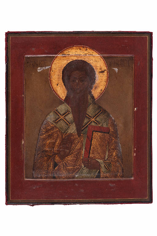 - NOTIZIE STORICO CRITICHE Antipa di Pergamo (... - Pergamo, 92) sarebbe stato, secondo una tradizione consolidata, il primo o il secondo vescovo della comunità cristiana di Pergamo e uno dei primi cristiani a subire il martirio a causa della fede. Antipa è menzionato nel Libro dell'Apocalisse (Ap 2,13), da Giovanni evangelista, il quale lo ricorda come un "fedele testimone, che fu ucciso tra voi, dove abita Satana". Dal contesto è possibile intuire che Antipa sia stato martirizzato a Pergamo, in Asia Minore, probabilmente al tempo delle persecuzioni dell'imperatore Nerone (54-68). La "passio" tramandata ricalca lo schema tipico agiografico: Antipa, vescovo della comunità cristiana di Pergamo, in età avanzata, fu arrestato in seguito ad una sommossa popolare; condotto dinnanzi al tribunale del prefetto della città, fu interrogato e come di consueto esortato a sacrificare agli dei, secondo gli ordini imperiali; per il suo rifiuto venne trascinato al tempio di Diana e rinchiuso in un toro di bronzo arroventato. Il suo culto è antichissimo in Oriente; l'iconografia lo raffigura quale vescovo. La nostra icona, della Scuola iconografica russa di Mstera, risale al secondo quarto del XIX secolo. "Scritta" su tavola intera ed incavata, a tempera all'uovo, raffigura Antipa, a mezzo busto e in posizione frontale, rivestito dai paramenti liturgici vescovili. Il sakkos, lumeggiato da finissimo assist in foglia d'oro, lo ricopre completamente e, a sua volta, è in parte coperto dall'omophorion verde, ricamato con due grandi croci, che pende sul petto. La mano destra è benedicente alla maniera ortodossa e la sinistra, ricoperta da un lembo dell'omophorion, regge il Vangelo chiuso, con coperta impreziosita da assist d'oro. Il volto, aureolato dal nimbo in foglia d'oro (simbolo della gloria di Dio in cui il santo è già immerso), è l'elemento focale, in quanto luogo della presenza dello Spirito divino. Lunghi capelli ricadono simmetricamente intorno al viso, inanellandosi sulle spalle; la lunga barba ricadente sul petto e i lunghi baffi racchiudono la bocca chiusa nel silenzio della contemplazione. Tutta l'attenzione è concentrata sullo sguardo che si irradia verso lo spettatore: i grandi occhi spalancati, circondati da profonde palpebre e occhiaie, si impongono per la loro forza e intensità, ma anche per la loro dolcezza. Tutto il viso, sulle gote, sulla fronte, mostra rughe profonde, tracce del digiuno e delle veglie in preghiera. L'icona del santo non vuol rappresentare semplicemente un istante della sua vita, ma sintetizzare la sua esperienza di ascesi e di fede, le caratteristiche del suo cammino storico di santità. \nArricchisce l'icona l'Oklad in argento sbalzato e cesellato, con punzoni di Mosca, 1834,N·D, Nikolai Lukich Dubrovin, maestro di saggio attivo a Mosca dal 1822 al 1855; argentiere E·A Ephraim Afanayev (?) attivo a Kalouga dal 1852 al 1858.
