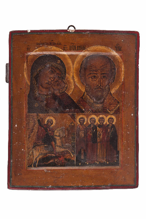 - NOTIZIE STORICO CRITICHE La nostra icona di Scuola moscovita risale alla metà del XVII secolo. A tempera all'uovo, con nimbi dei santi in foglia d'oro, e crisografia che lumeggia la scena, su tavola di tiglio incavata, l'icona rappresenta, nella parte alta, affiancati, la Madre di Dio di Korsun, e san Nicola taumaturgo; nella fascia inferiore san Giorgio, san Ticone, santa Mina , santo Stefano e san Dimitrij. Nella fascia superiore a sinistra per chi ossercva è rappresentata la Madre di Dio di Korsun, così denominata dalla città di Korsun (l'antica Chersonneso) situata in Crimea. In questa città, antico emporio bizantino, fu battezzato il principe di Kiev Vladimir che cristianizzò la Russia nel 988. \nSecondo la tradizione, l'icona della "Madre di Dio di Korsun'", dipinta dal santo evangelista Luca, sarebbe stata traslata dallo stesso principe da Korsun a Kiev e poi a Novgorod. Probabilmente all'epoca di Ivan il Terribile, che conquistò la città nel XVI secolo, l'icona, che aveva già la fama di operare miracoli, fu trasportata, insieme ad altre sacre reliquie della città, a Mosca e fu collocata definitivamente nella cattedrale della Dormizione del Cremlino. La Madre di Dio di Korsun', detta anche Madonna delle Carezze, si riallaccia al tipo greco della Glikofilousa, dove i volti del Bambino e di Maria sono legati da un totale coinvolgimento, cui partecipa anche chi guarda. \nSe richiama il tipo della Tenerezza, per il tenero abbraccio della Madre e del Figlio, si distingue tuttavia per alcuni particolari iconografici: la Vergine e il Figlio sono raffigurati fino alle spalle; la Madre ha il capo reclinato verso il Bimbo, che è stretto a lei, guancia contro guancia. La Madre di Dio è vestita come una basilissa, un'imperatrice. Il blu-verde della tunica simboleggia la terra e quindi la sua appartenenza all'umanità, ammantata di divinità (il maphorion). La porpora scura (indossata dalle imperatrici vedove quando erano chiamate a reggere il regno in vece del figlio ancora minorenne) indica la regalità. Le tre stelle (una è nascosta dal Bambino), dicono la verginità di Maria prima, durante e dopo il parto. I volti, capelli e barba corti e incanutiti, carnagione scura, naso greco, occhi profondi, spalancati sull'eternità e bocca chiusa trasmettono un senso di mistero, e dolcezza mista a tristezza. \nAccanto è raffigurato San Nicola taumaturgo, anch'egli solo fino alle spalle, con un accenno alle sue vesti liturgiche di vescovo, ma l'osservatore è "colpito" dal suo volto, dallo sguardo profondo e severo, dalle rughe che solcano la sua alta fronte stempiata e le sue guance a definirne la vita ascetica e di privazioni è già il santo trasfigurato, la cui appartenenza al mondo della spiritualità è sottolineato dal nimbo in foglia d'oro che circonda il suo capo come quello di Maria, del Bambino e dei santi raffigurati nella fascia inferiore. Il taglio dell'immagine sacra appena al di sotto delle spalle esalta i volti, in cui traspare il legame d'amore eterno tra la Madre e il Figlio. \nNella fascia inferiore, suddivisa in due riquadri sono raffigurati: a dx (per chi guarda) san Giorgio e il drago, a sx, san Ticone, san Mina , santo Stefano e san Dimitrij, raffigurati secondo tradizione, tutti con il Vangelo in mano, a dimostrare il loro essere cristiani; il Sacro libro però non viene, in segno di rispetto, toccato dalle dita, ma viene trattenuto con una parte del manto; ecco il giovane cavaliere che trafigge l'orrendo drago nello scuro pantano in cui vive; nel riquadro accanto, raffigurati in piedi e frontalmente, San Ticone vescovo di Amato, molto venerato in Russia; egli tiene fra le mani, il Vangelo chiuso; San Mina, il santo più popolare in Egitto, ma venerato anche in Oriente e Occidente, con il volto affilato e rugoso e occhi scuri e incavati da asceta; benedice con la destra e tiene il vangelo chiuso con la sinistra; Santo Stefano il protomartire giovinetto che tiene con la destra una piccola croce rossa ortodossa e, infine, San Demetrio, anch'egli con piccola croce (crisografata) e Vangelo; anch'egli giovane martire. \nLacche e finissima crisografia esaltano i colori dei capelli, delle vesti, delle architetture. Le iscrizioni in slavo denominano i personaggi raffigurati; intorno al nimbo di Maria i sacri digrammi: Madre di Dio. La Riza è in argento sbalzato e cesellato. Punzoni di Mosca 1861 I·A corrispondente a I. Adeev ufficiale di saggio attivo a Mosca dal 1852 al 1862. Punzone dell'argentiere illeggibile sia nel ripiego del bordo che nell'aureola.